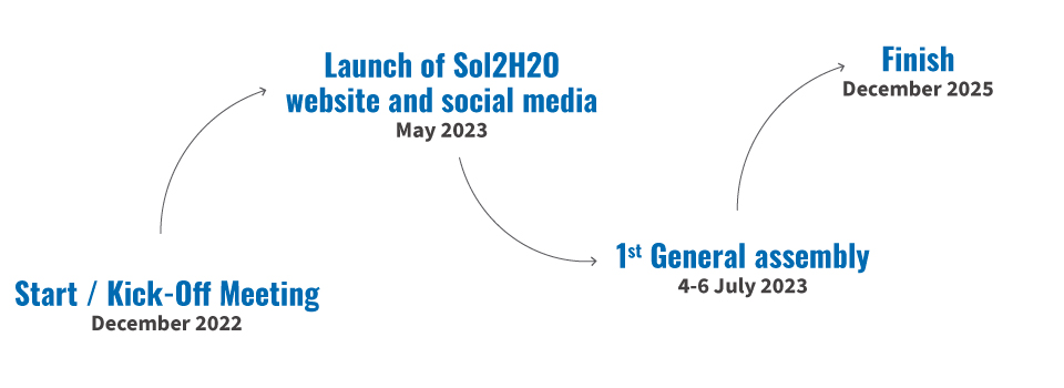Reuniendo la experiencia de tres socios no WIDENING (TOP) que presentan algunos de los más destacados antecedentes e Infraestructura de Investigación (RI), a nivel europeo, en el desarrollo de tecnologías de producción de agua y tratamiento de aguas residuales (WP&WT) impulsadas por energía solar, Sol2H2O pretende apoyar al socio Coordinador (WIDENING) en el desarrollo y establecimiento de investigación de alto nivel en este campo. Basándose en la destacada experiencia del WIDENING RI en tecnologías de energía solar y en sus experiencias preliminares en el campo del nexo agua-energía, Sol2H2O pretende desarrollar e implementar una estrategia científica común, con un fuerte enfoque en la mejora de la capacitación de los investigadores, yendo más allá de las capacidades puramente científicas y fortaleciendo sus habilidades de gestión y administración de la investigación.